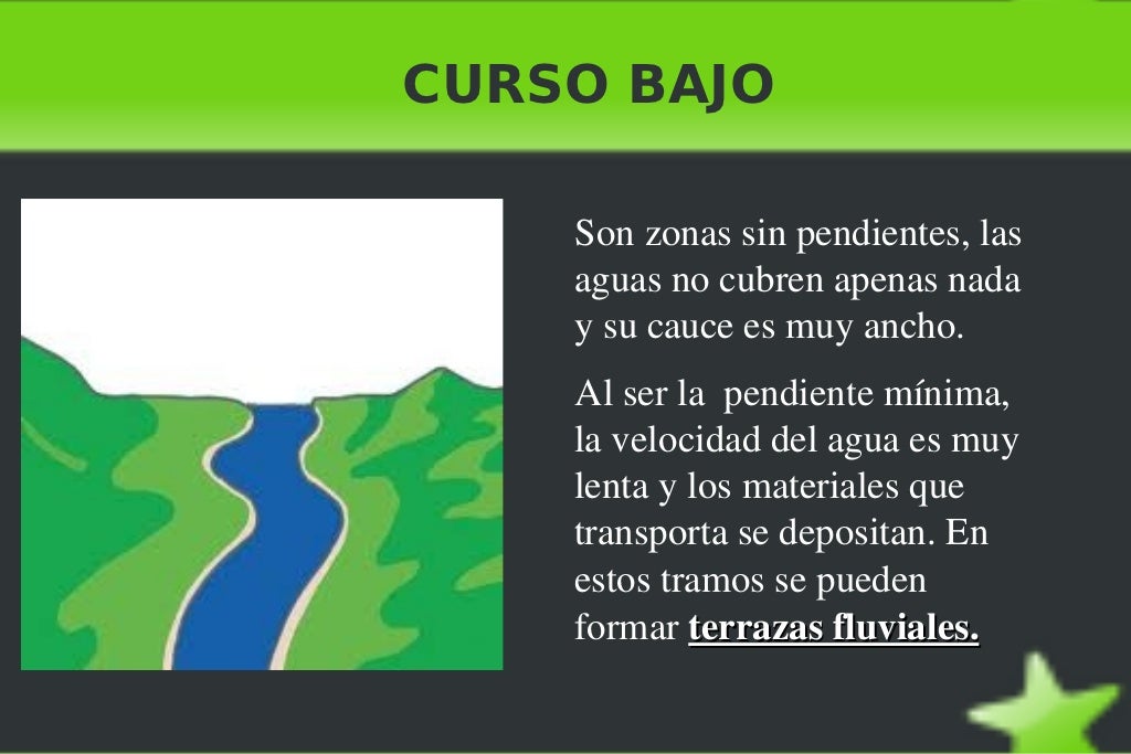 que surgen por la unión de diversos. torrentes, aguas procedentes de los deshielos, etc. La cantidad de agua que lleva un de denominna. caudal, dependiendo de pluviosidad. temperatura. entre. otros elementos. Le erosión es tanto más intensa cuanto mayores sean. el caudal (cantidad de agua que lleva el río.