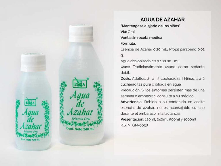 Agua de azahar es para dolores de estómago y menstruales. Sus propiedades ansiolíticas y como calmante, ayudan a reducir los dolores estomacales, dolores bajos abdominales como los producidos por la menstruación, calma las náuseas y los vómitos; contiene pectina que ayuda a combatir la diarrea e indigestión leve.