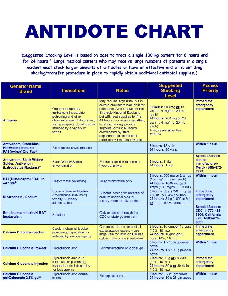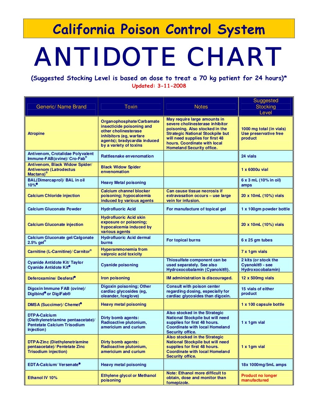 Antidotes. Attached below is a guideline for the stocking of recommended antidotes in acute care settings. It should be noted that this does not replace the usual symptomatic and supportive care necessary for the treatment of a poisoned patient. This initial dose listed is the amount typically required to treat an average 100 kg patient in the.