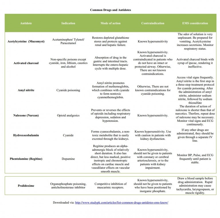 List of Common Drugs & Their Antidotes That EMS Should Know! StudyPK