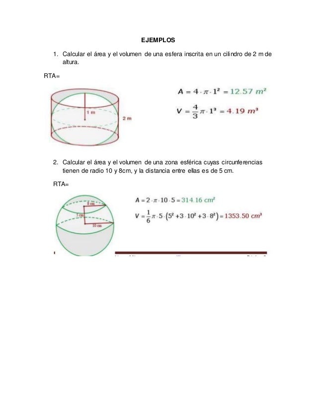 Área (A) y volumen (V) de la esfera de radio R. Ejemplo 1: calcular el área y el volumen de un esfera de radio R = 3 metros. Sólo tenemos que sustituir en las fórmulas. Calculamos el área: Calculamos el volumen: Los resultados coinciden, pero el área es en metros cuadrados y el volumen es en metros cúbicos. Ejemplo 2: Si el área de una.