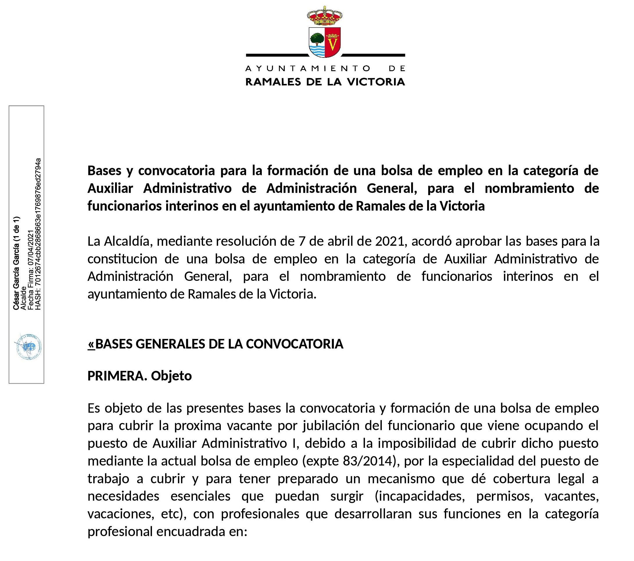 Bolsa de empleo de Auxiliar Administrativo Ayuntamiento de Ramales de la Victoria