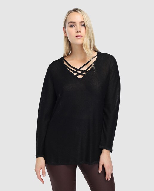 Jersey negro de mujer talla grande Couchel con tiras cruzadas en escote