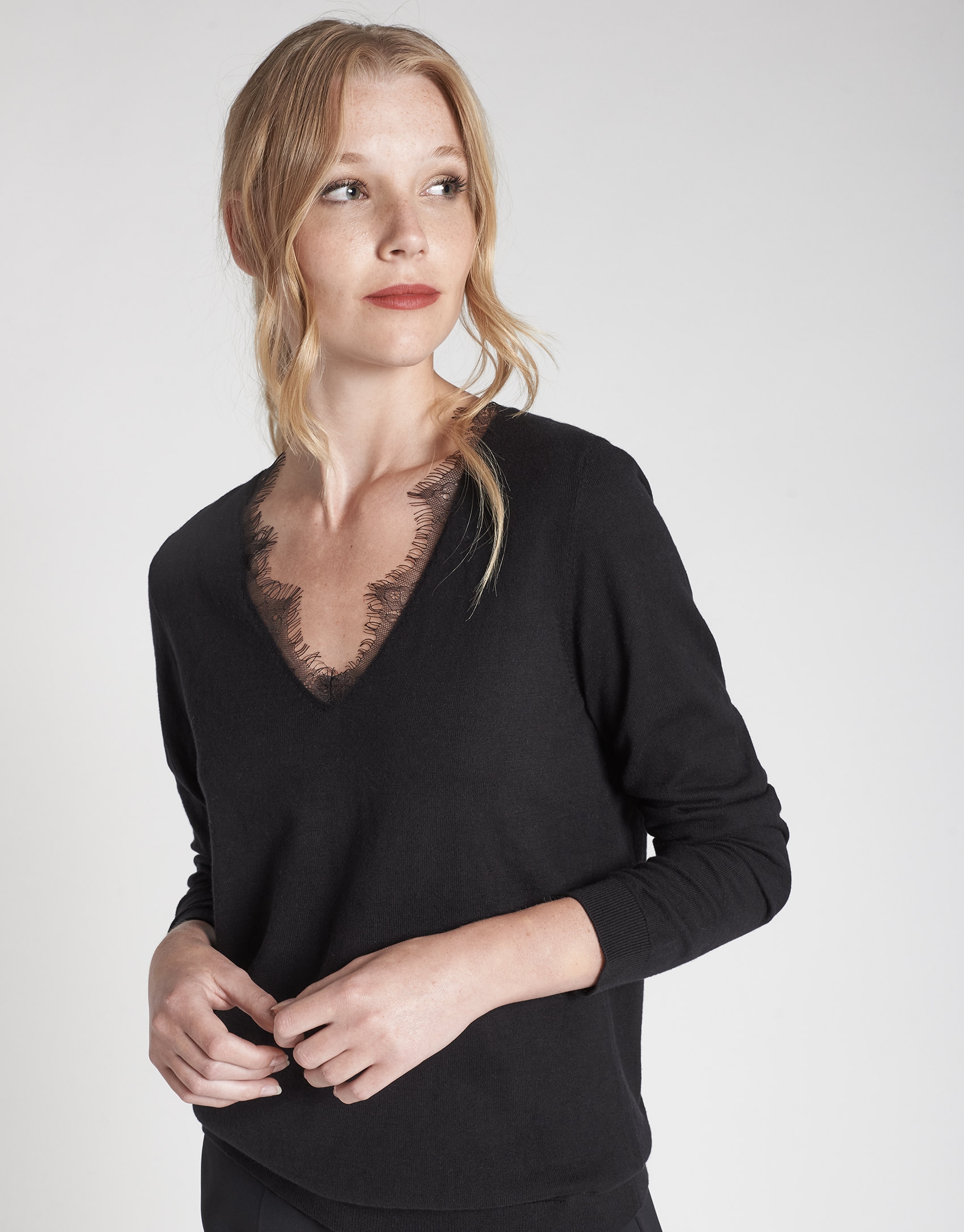 Jersey negro escote pico con encaje Mujer Roberto Verino