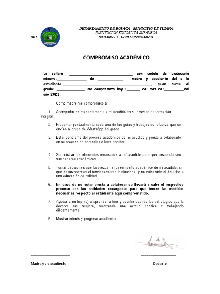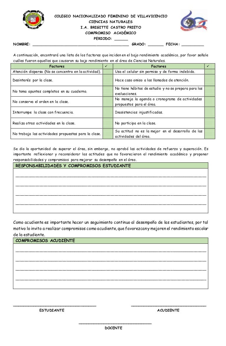 Formato Compromiso Academico para Estudiantes Con Desempeño Bajo Maestros Plan de estudios