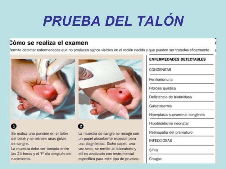 Qué es la prueba del talón. Es un análisis de sangre que se realiza tomando una muestra de sangre del talón del bebé. Esta prueba se realiza entre las 48 y 72 horas de vida del bebé y se repite entre el cuarto y séptimo días. No es una prueba de diagnóstico, sino que muestra si deben realizarse más estudios o descartar la existencia.