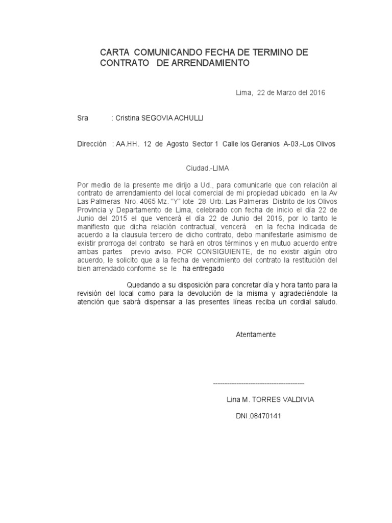 Ejemplo De Carta De Terminacion De Contrato De Arrendamiento Images and Photos finder