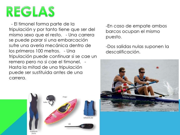 Reglas del remo. El remo de competición implica una serie de reglas que los deportistas deben cumplir para evitar ser descalificados. Entre ellas se incluyen: Cambio de carril: Hay seis calles separadas en una prueba de remo olímpico, con una calle asignada a cada embarcación. Los atletas y los equipos pueden pasar de un carril a otro si lo.