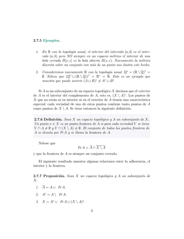 subconjunto A ˆ X. En este tema de niremos los conceptos de exterior, frontera, aislado y derivado del conjunto A. Dichos conceptos clasi can los puntos de X por su situaci on respecto de A. Definici on 3.6.1. LlamaremosexteriordeA enX alsubconjuntoExt(A) := Int(X nA). Los elementos de Ext(A) se dicen puntos exteriores a A. Propiedades 3.6.2.